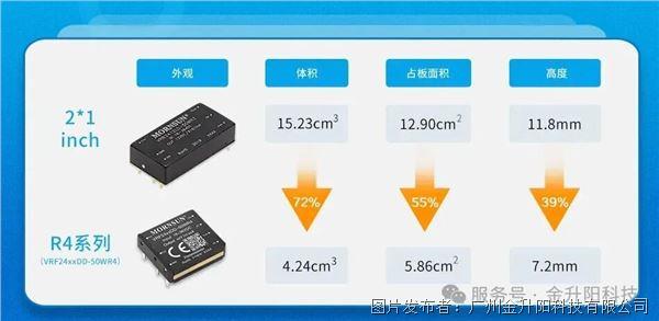 VRF24_DD-50WR4系列与行业传统2*1 inch的灌封常规品相比,实现了更高功率密度的设计以及性能提升,产品尺寸仅为25.82*22.80*7.20mm。